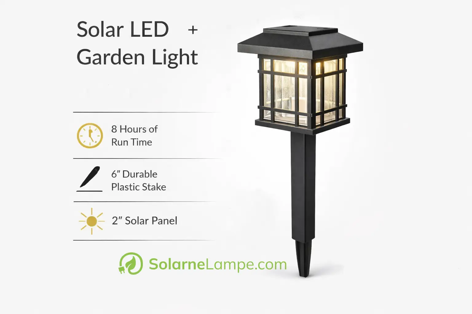 Elegantna solarna baštenska lampa u retro fenjer dizajnu. Savršena za osvetljenje staza, cvetnih lejа i dvorišta. Automatski se pali u sumrak i svetli do 8 sati. Montaža je jednostavna, samo zabodite u zemlju. Bez kablova i bez struje.